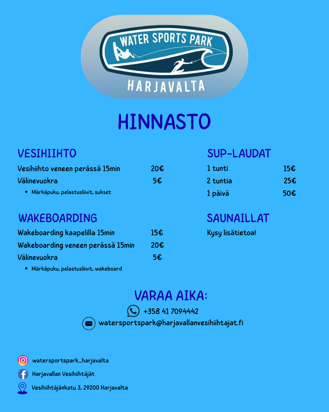 - Tilan vuokra: 150 €/päivä ilman vesihiihtoa